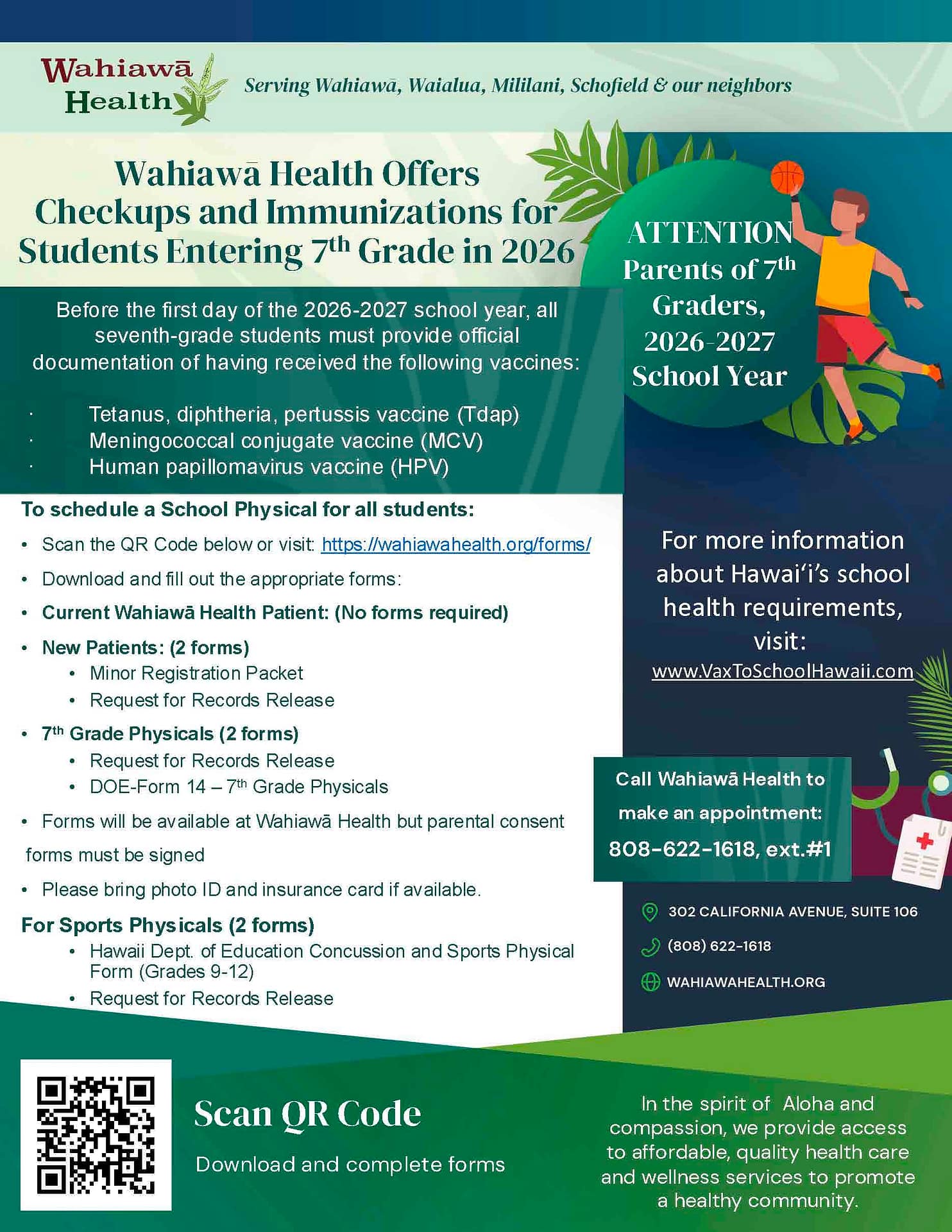Visit Wahiawā Health for a well-child exam, submit the DHS1193 Form that Wahiawā Health will provide and a $50 incentive card will be mailed within 4-6 weeks. Call Wahiawa Health at 808-622-1618 to make a well-child exam appointment.