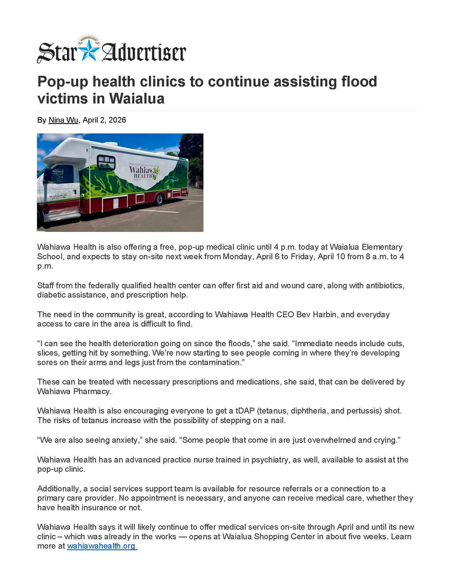 Star-Advertiser – Pop-up Health Clinics to Continue Assisting Flood Victims in Waialua